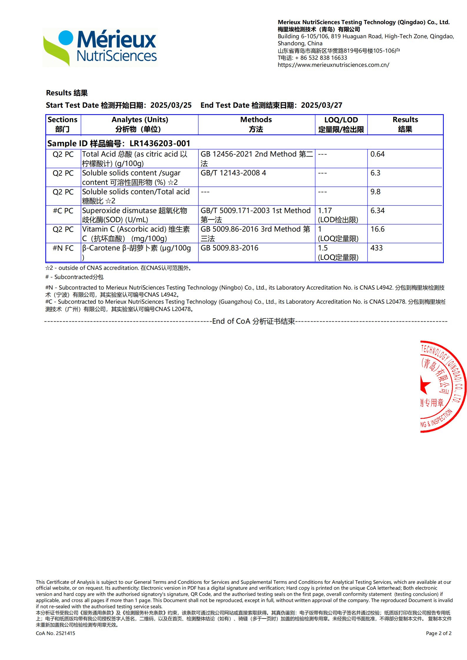 农产品检测报告