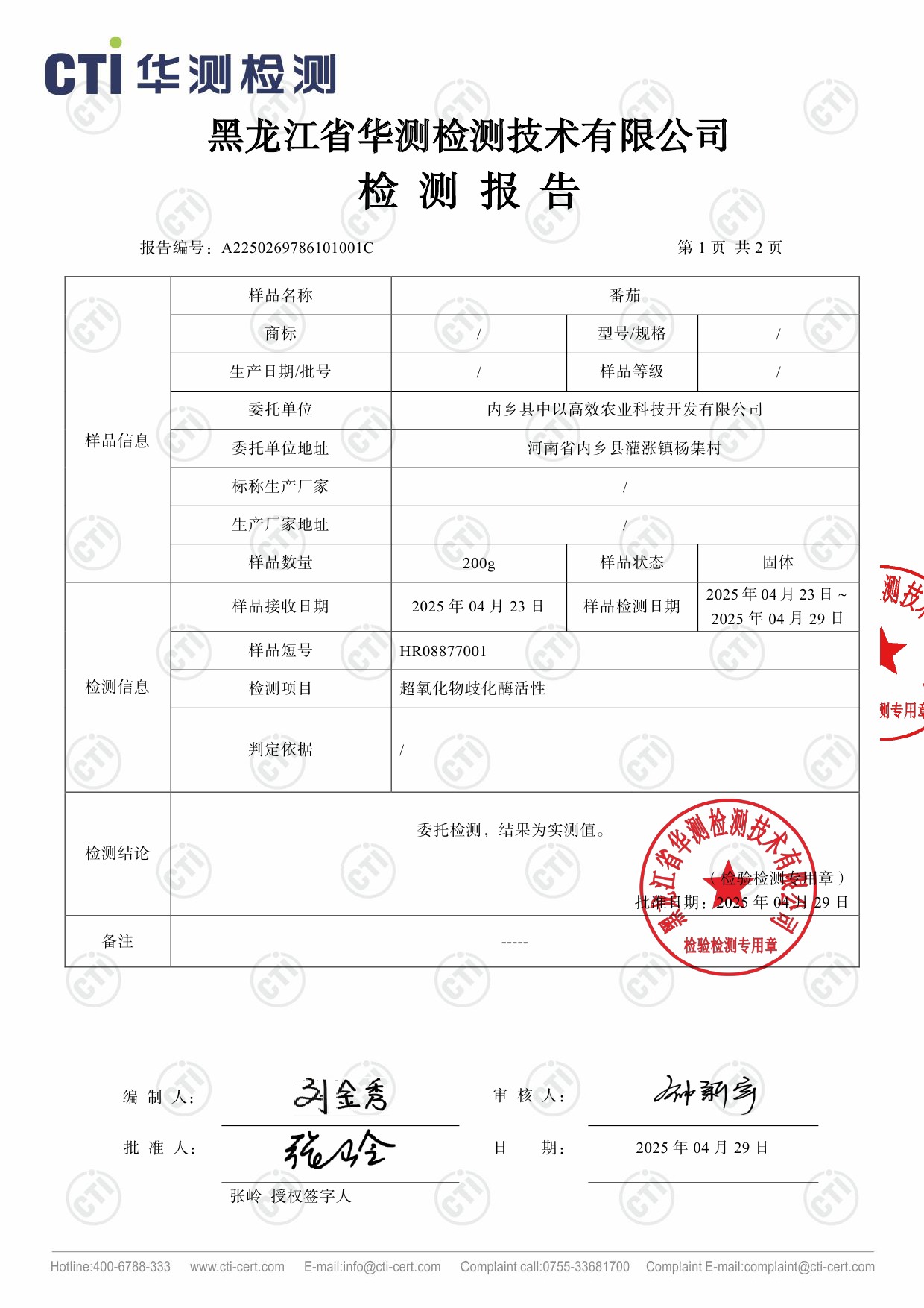 中以农业园5号暖棚番茄SOD检测报告
